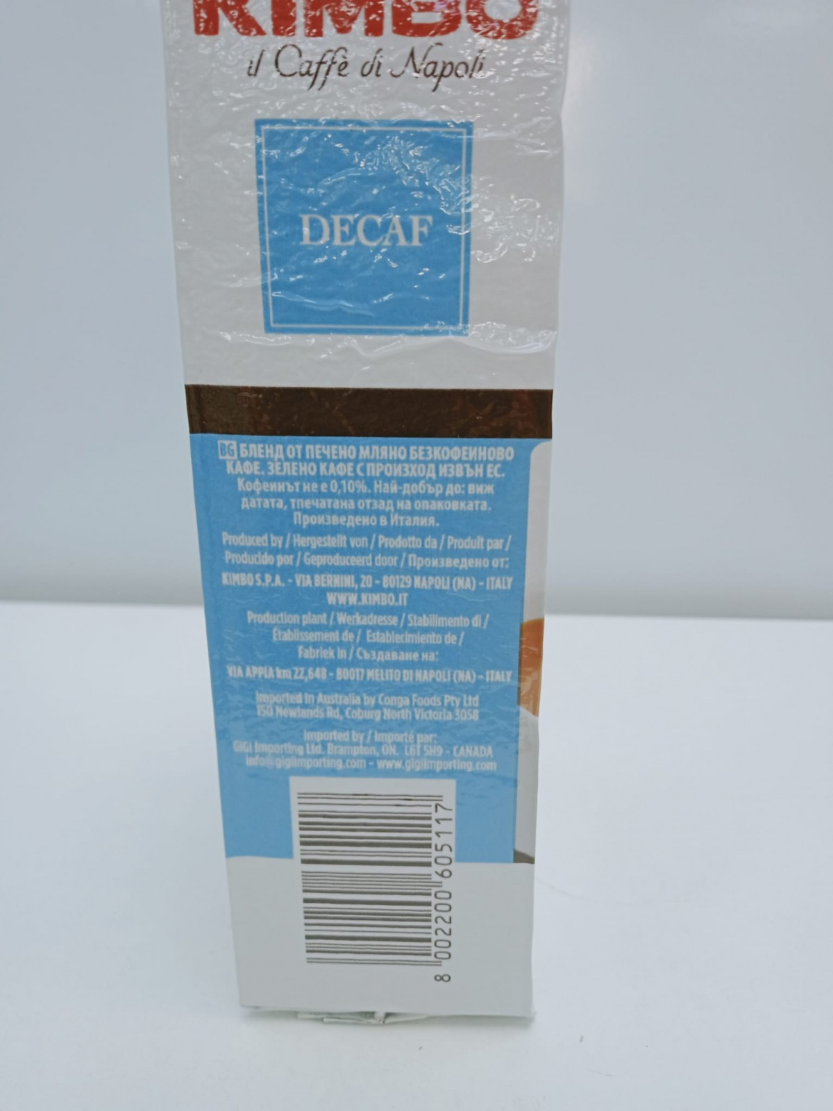 Cafea prăjită, măcinată și decofeinizată KIMBO DECAF.