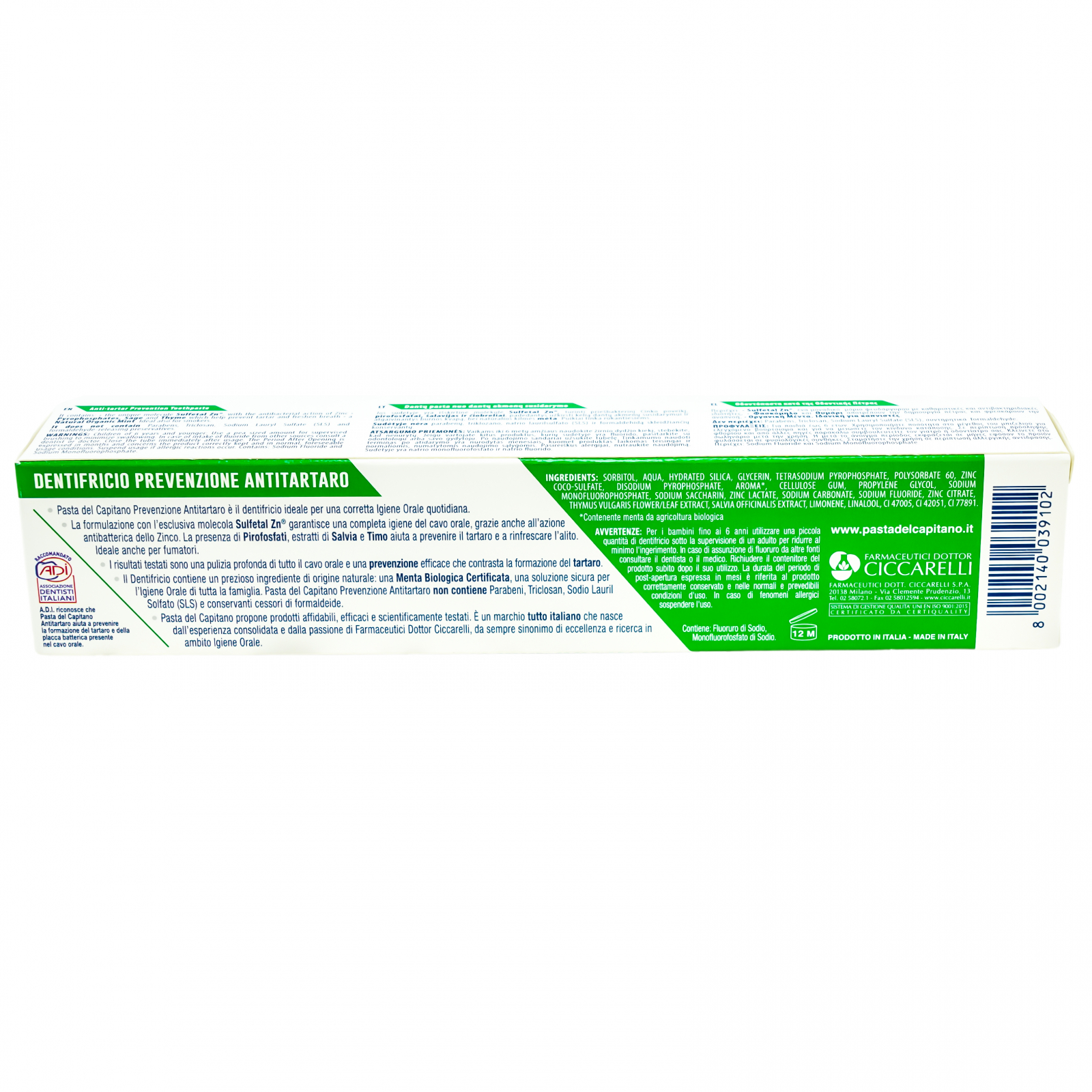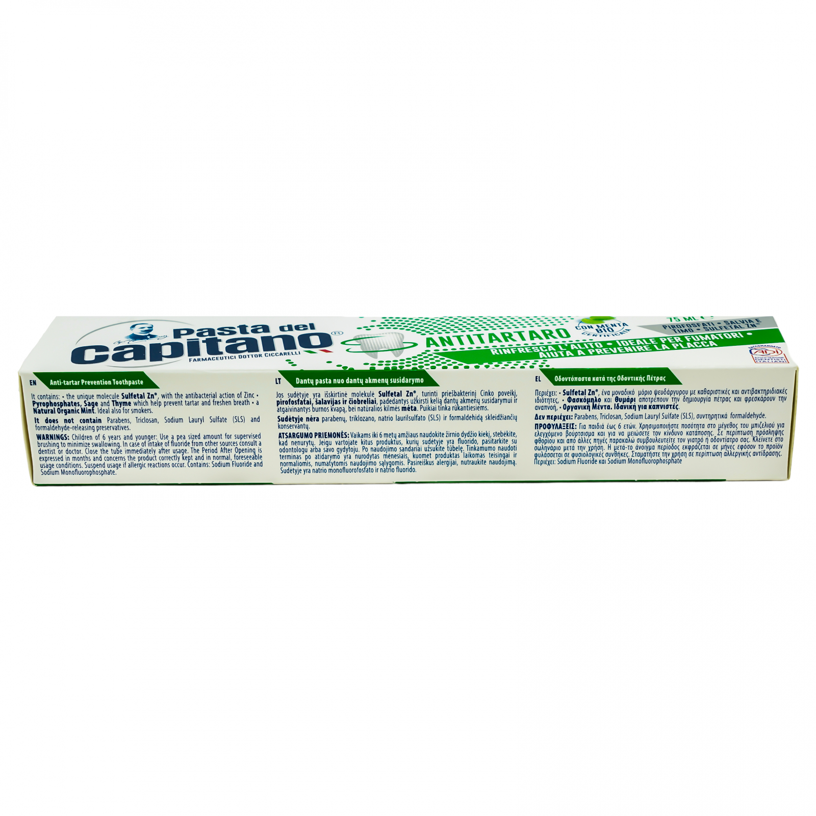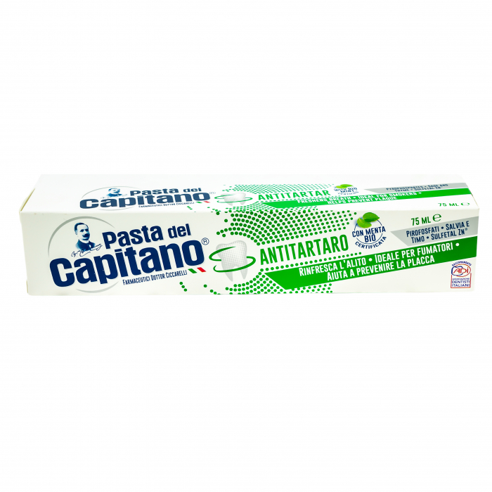 Pastă de dinți cu mentă Bio cu efect antitartru PASTA DEL CAPITANO. Greutate netă: 75 ml. Nu conține parabeni, Triclosan, SLS (Sodium Lauryl Sulphate) și conservanți cu eliberare de formaldehidă. Împrospătează respirația, ideală pentru fumători, ajută la prevenirea plăcii bacteriene. Formula exclusivă cu molecula Sulfetan ZnR , asigură o igienă completă a cavității orale, grație și acțiunii antibacteriene a zincului. Prezența pirofosfaților, a extractelor de salvie și cimbrișor ajută la prevenirea tartrului și la împrospătarea respirației. Produsul conține un ingredient prețios de origine naturală, mentă obținută din agricultura biologică, o soluție sigură pentru igiena orală a întregii familii. Ingrediente: vezi „Ingredients”. Conține Fluorură de Sodiu și Monofluorofosfat de Sodiu. Instrucțiuni de utilizare pentru copiii mai mici de 6 ani: folosiți o cantitate mică de produs sub supravegherea unui adult pentru a reduce la minim riscul de înghițire. În cazul în care sunt administrate și alte produse pe bază de fluorură, consultați dentistul sau medicul dvs. Închideți recipientul după utilizare. Perioada de valabilitate după deschidere exprimată în luni, se referă la produsul corect păstrat și în condiții normale și previzibile de utilizare. În cazul în care apar fenomene alergice, suspendați utilizarea. A se utiliza în termen de 12 luni de la deschidere. PRODUS ÎN ITALIA.