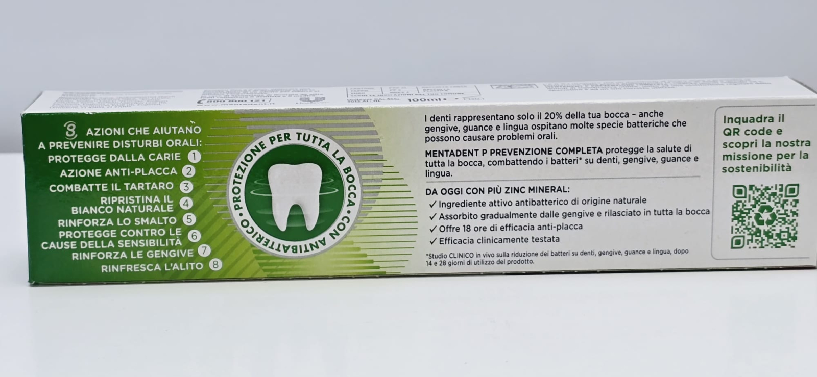 Pastă de dinți cu zinc mineral MENTADENT PREVENZIONE COMPLETA 100 ml.