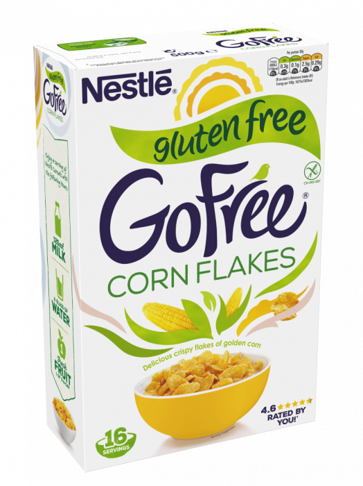Nestle GOFREE Corn Flakes reprezintă fulgi de porumb fără gluten consumați la micul dejun, în aproximativ 12 porții a câte 30 g. fiecare. O porție furnizează circa 19% din valorile nutriționale de referință pentru vitamine (B2, B3, B5, B6, B9). Pentru adulți se recomandă între 5 și 8 linguri, iar pentru copii, 4 sau 5 linguri. Pentru un mic dejun complet, se adaugă la fulgii de porumb 125 ml de lapte, un pahar cu apă și un fruct de sezon. Ingrediente: făină de porumb 99,8%, zahăr, sare, dextroză, sirop de zahăr brun parțial invertit, corector de aciditate fosfați de sodiu, vitamine: acid pantotenic, riboflavină, Vitamina B6, acid folic. Poate conține urme de arahide și fructe cu coaja lemnoasă. Valori nutriționale medii/ 100 g de produs: energie: 1613 kj – 380 kcal, grăsimi: 1,4 g din care acizi grași saturați: 0,6 g, carbohidrați: 83 g din care zaharuri: 9,1 g, fibre: 4,2 g, proteine: 7,4 g, sare: 1,91 g. Valori nutriționale medii/ 30g: energie: 484 kj – 114 kcal, grăsimi: 0,4 g din care acizi grași saturați: 0,2 g, carbohidrați: 25 g din care zaharuri: 2,7 g, fibre: 1,3 g, proteine: 2,2 g, sare: 0,57 g. Valori nutriționale medii/ 30g + 125 ml lapte parțial degresat: energie: 738 kj – 174 kcal, grăsimi: 2,5 g din care acizi grași saturați: 1,3 g, carbohidrați: 31 g din care zaharuri: 8,6 g, fibre: 1,3 g, proteine: 6,5 g, sare: 0,72 g. Vitamine: 100 g (%VNR)/30 g/30g + 125 ml lapte parțial degresat: Riboflavină: 1,33 mg (95%)/0,40 mg/0,63 mg, Niacină: 16,8 mg (105%)/5,04 mg/5,16 mg, Vitamina B6: 1,23mg (88%)/0,37 mg/0,43 mg, Acid folic: 183 µg (92%)/54,9 µg/59,5 µg, Acid pantotenic: 3,88 mg (65%)/1,16 mg/1,61 mg. Pentru a menține produsul crocant, după deschidere, pliați punga din interiorul ambalajului și păstrați-l la loc uscat, departe de surse de căldură. A se consuma înainte de sfârșitul lunii: vezi pe ambalaj. PRODUS ÎN UE.