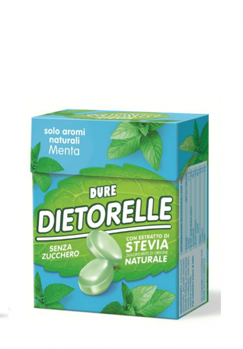 Bomboane dropsuri fără zahăr cu gust de mentă DIETORELLE. Greutate netă: 40 g. Nu conțin gluten. Conțin extract de ștevie, îndulcitor de origine naturală și doar arome naturale. Ingrediente: îndulcitori (izomalt, glicozide steviolice (extract de ștevie)), aromă naturală (mentă), acidifiant (acid citric), colorant (clorofilă). Poate conține urme de lapte. Valori nutriționale medii/100 g: energie: 997 kj – 239 kcal, grăsimi: 0,1 g din care acizi grași saturați: 0 g, carbohidrați: 98 g din care zaharuri: 0 g și polioli: 98 g; fibre: 0 g; proteine: 0 g, sare: 0 g. Consumul excesiv poate avea efecte laxative. A se consuma până la sfârșitul lunii: vezi pe ambalaj. PRODUS ÎN ITALIA.