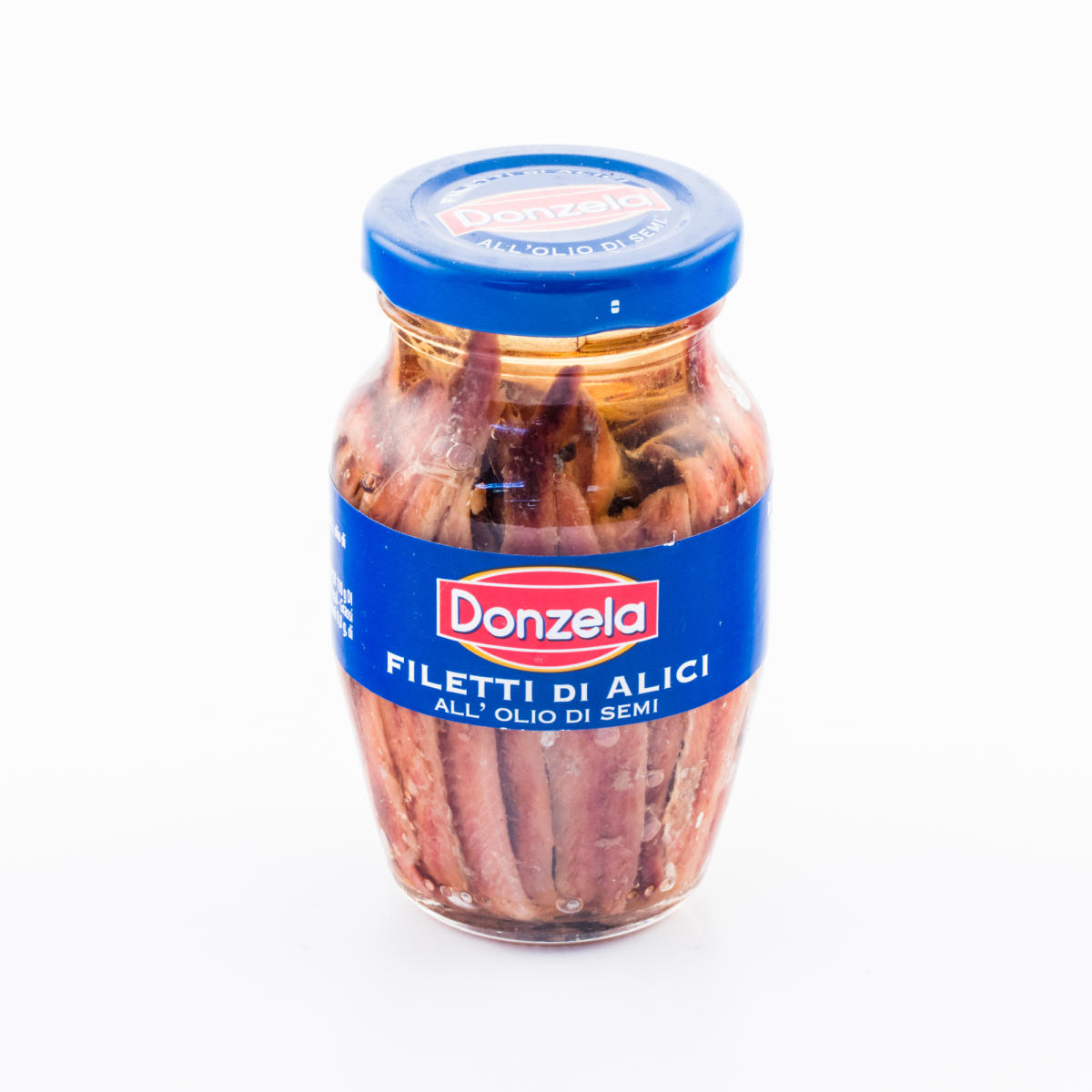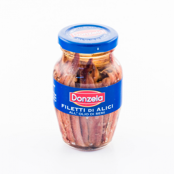 Hamsie filé în ulei de floarea-soarelui DONZELA Greutate netă: 160g (produs scurs: 81g).