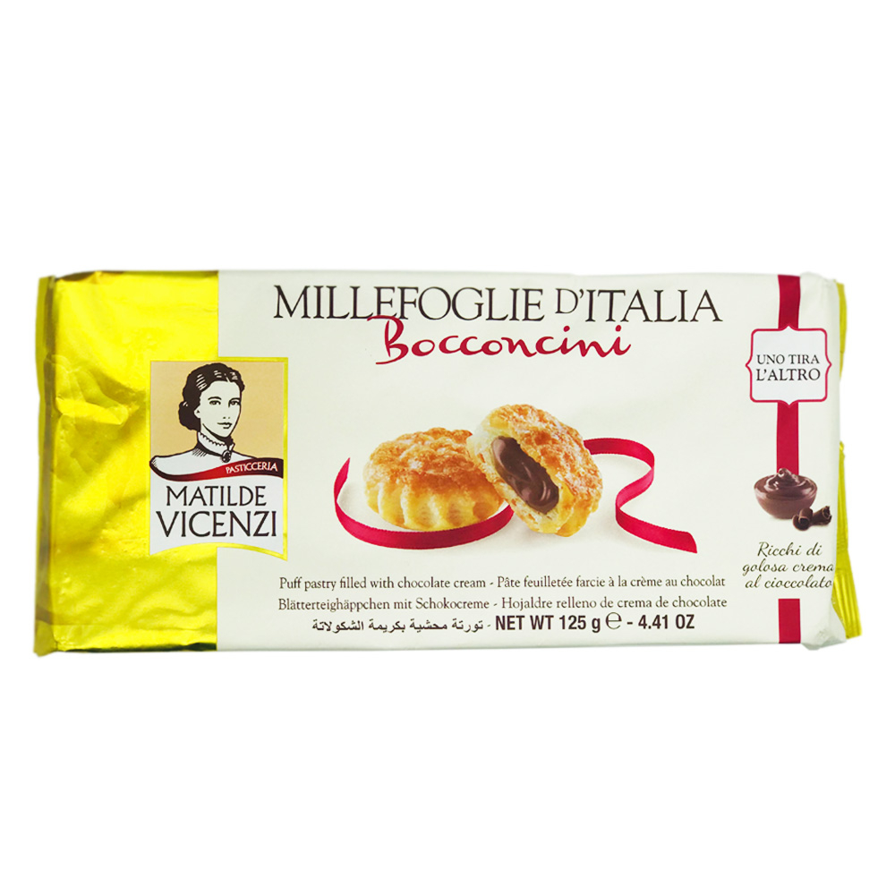 Prajituri foitaj umplute cu cremă de ciocolata MATILDE VINCENZI. Greutate netă: 125g - 16 batoane. Ingrediente: Cremă de ciocolată 35% [ciocolată 60% (zahăr, masă de cacao, dextroză, pudră de cacao, emulgator: lecitină de floarea soarelui), zahăr, ulei de palmier, ulei de floarea soarelui, zer praf, pastă de alune, arome], făină de grau, margarină vegetală (ulei de palmier, ulei de floarea soarelui, apă), zahăr, sare, unt. Nu conține grăsimi hidrogenate. A se păstra la loc răcoros și uscat, ferit de surse luminoase. Valori nutriționale pentru 100 g de produs: Valoarea energetică: 2232 kJ/535 Kcal, Grăsimi: 30,5 g. (din care acizi saturați 18,3 g), Carbohidrați: 56,7 g. (din care zaharuri 27,3 g.), Fibre: 3 g., Proteine: 6,8 g., Sare: 0,33 g.