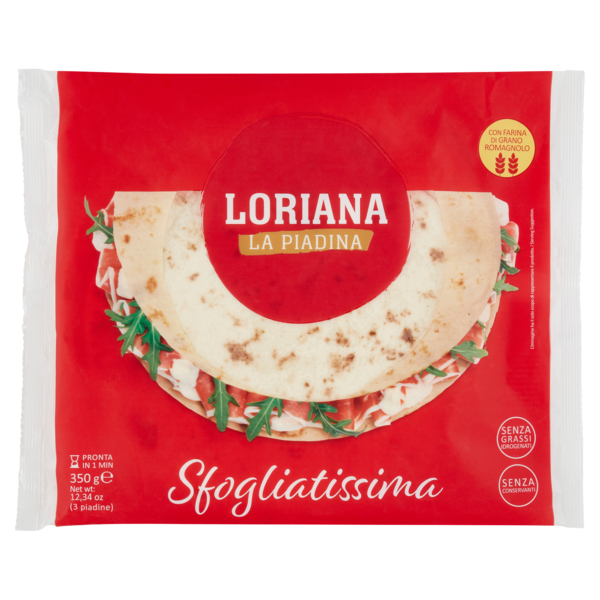 Lipie extra subțire LORIANA. Greutate netă: 350 g. Ambalajul conține 4 bucăți. Nu conține conservanți și grăsimi hidrogenate. Mod de preparare: Pe plită: circa 2 minute la temperatură medie; în cuptorul încălzit: circa 2 minute; în cuptorul cu microunde: circa 1 minut; în tigaie antiaderentă: circa 2 minute. Ingrediente: Făină de grâu moale tip „0”, apă, untură, sare, ulei extravirgin de măsline, agenți de afânare: carbonat acid de sodiu, difosfat disodic, tartrat monopotasic. Poate conține urme de soia. Ambalat în atmosferă protectoare. Valori nutriționale medii/100 g: energie: 1665 kj – 397 kcal, grăsimi: 18,0 g din care acizi grași saturați: 10,0 g, carbohidrați: 50,5 g din care zaharuri: 2,0 g, fibre: 2,0 g, proteine: 7,3 g, sare: 1,5 g. Mod de conservare: A se păstra în cămară sau în alt loc răcoros și uscat. După deschidere, a se păstra la frigider și a se consuma în 7–8 zile. A se consuma înainte de: vezi data pe ambalaj. PRODUS ÎN ITALIA.