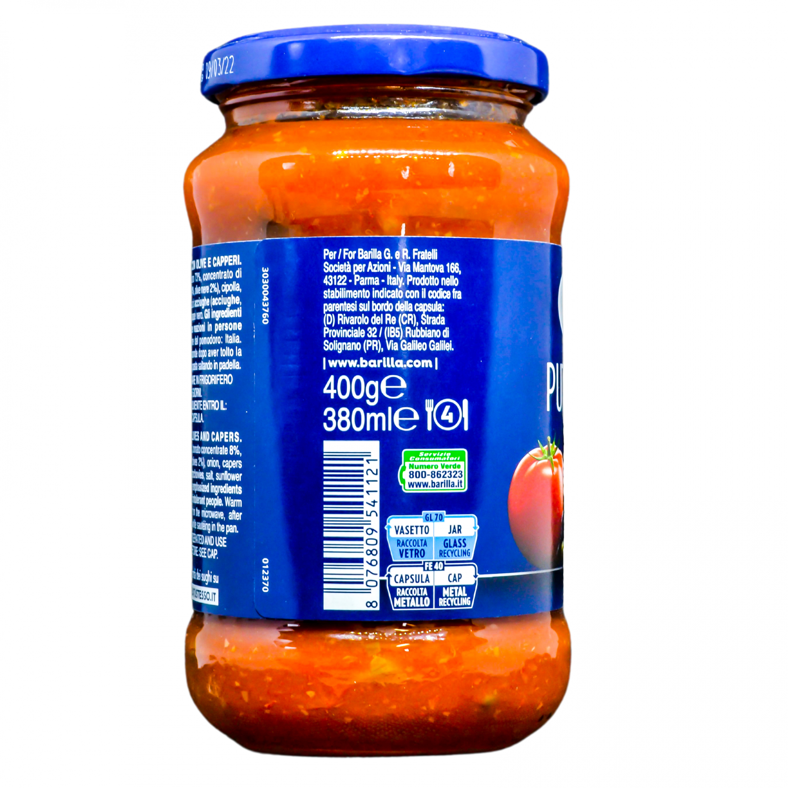 Ingrediente: pulpă de roșii 73%, concentrat de roșii 8%, măsline 6% (4% verzi, 2% negre), ceapă, capere 5%, ulei de floare soarelui, pastă de hamsie (hamsie, sare, ulei de floare soarelui), ardei iute 0,04%, piper negru.