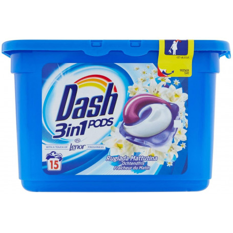 Invatorul detergent Dash 3 în 1 Roua dimineții 15 capsule are în pachetul său 15 pernuțe lichide, cu un parfum deosebit. Se poate folosi atât pentru spălarea manuală, cât și pentru folosirea în mașina de spălat.