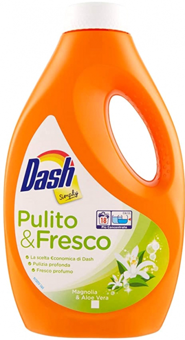 Detergentul lichid de rufe pentru spălare automată și manuală cu parfum de magnolie și aloe vera DASH SIMPLY PULITO & FRESCO 990 ml are o formulă concentrată.