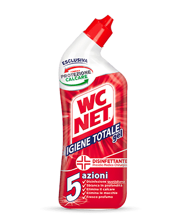 WC Net Igiene Totale este un dezinfectant gel pentru vasul de toaletă cu o formulă specială ce elimină 99,99% din bacterii. Igienă totală în 5 paşi: dezinfectează, albeşte în profunzime, elimină calcarul, elimină petele şi parfumează.